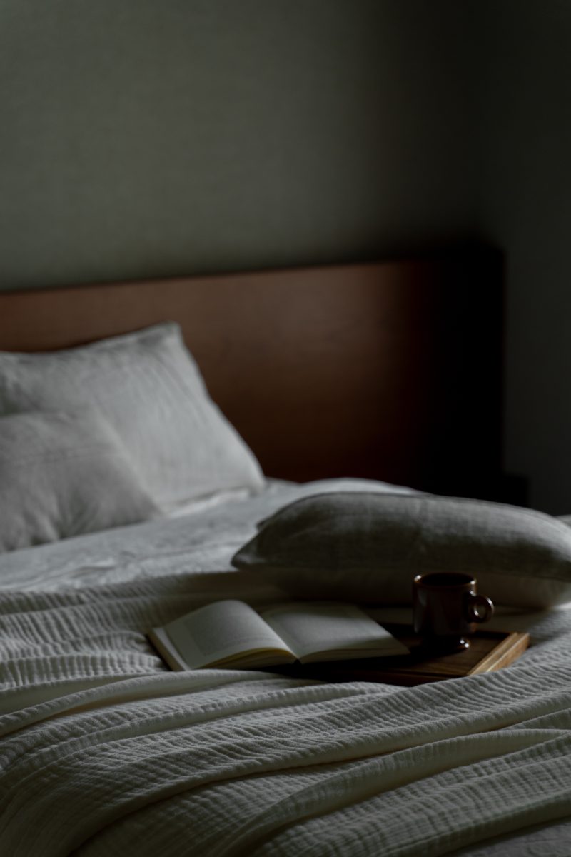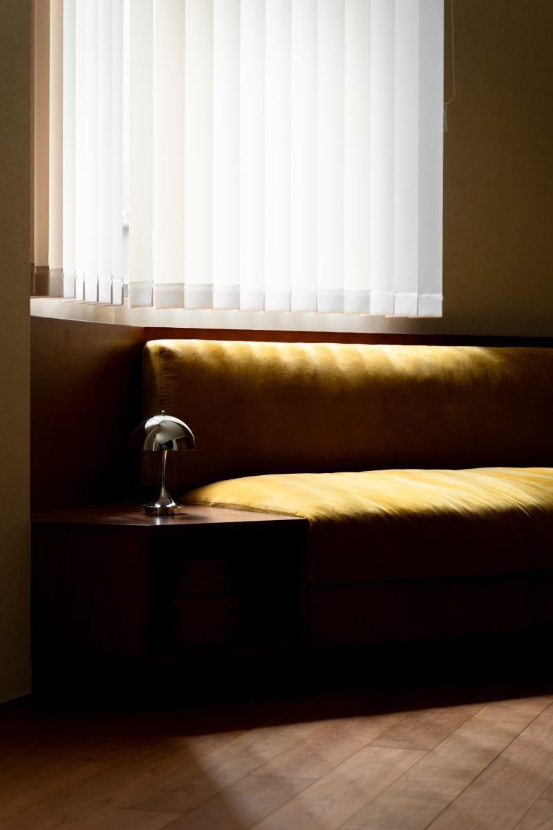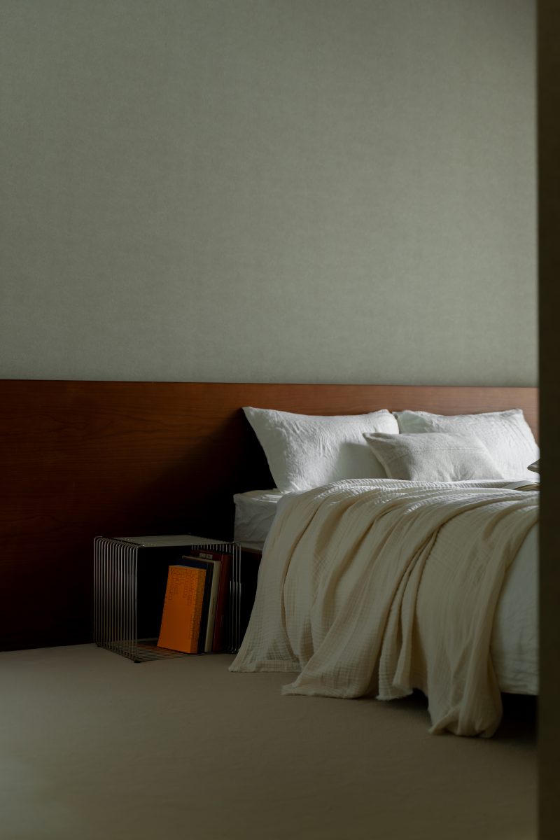 3mを越える1枚板からなるベッドボードが、心落ち着く上質さを醸し出します。