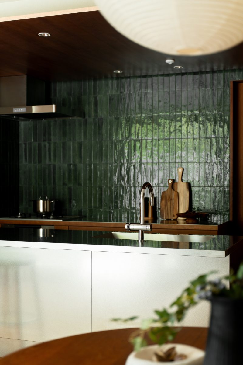 1つ1つ濃淡の違うイタリアタイルの緑と、ひんやりクールなステンレス、