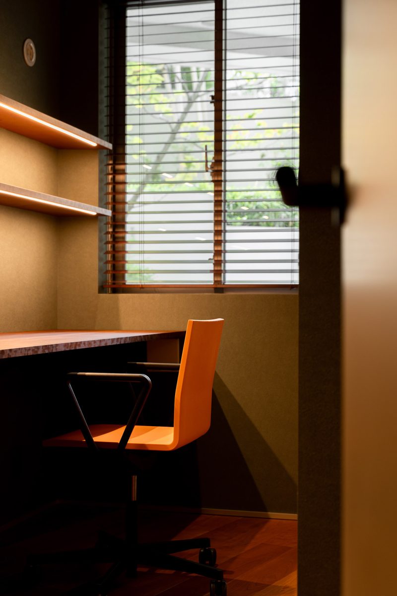 3m越えのデスクがある書斎。頭上の棚には間接照明が仕込まれています。