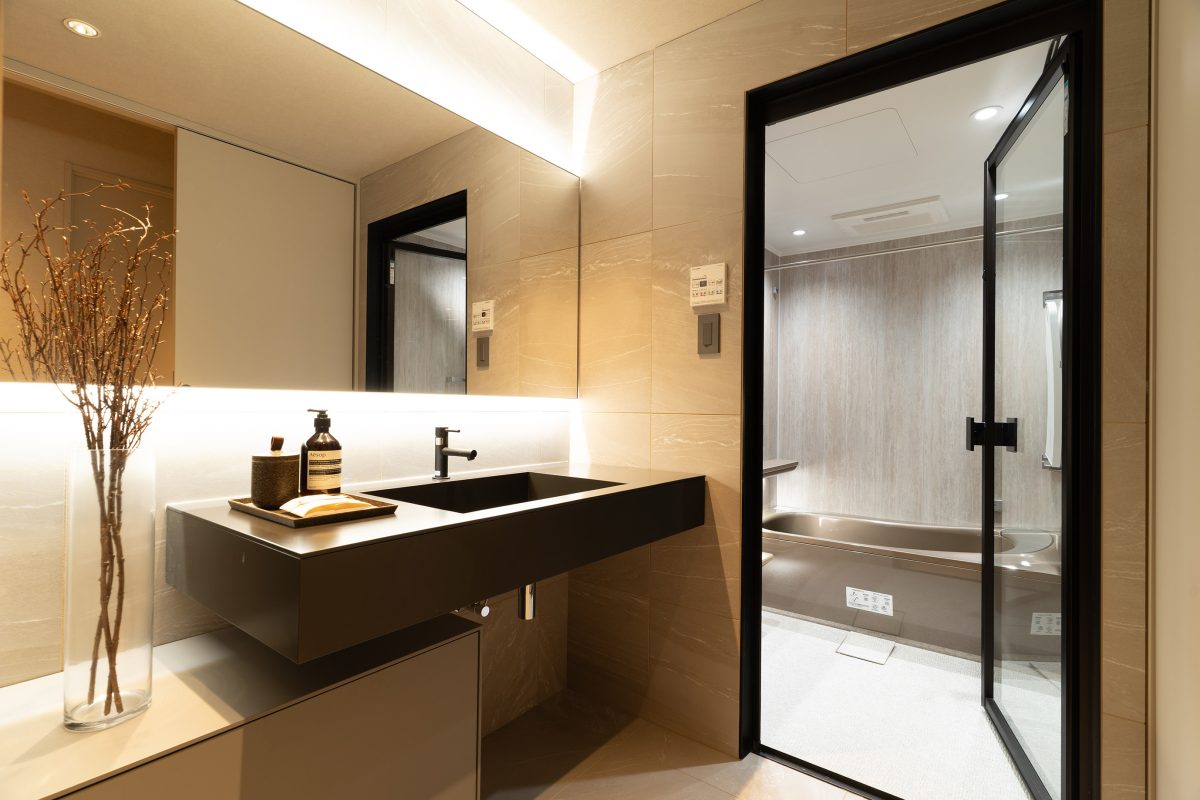 大きな鏡と黒い洗面台、スタイリッシュな壁面がホテルライクな雰囲気をもつ洗面空間。