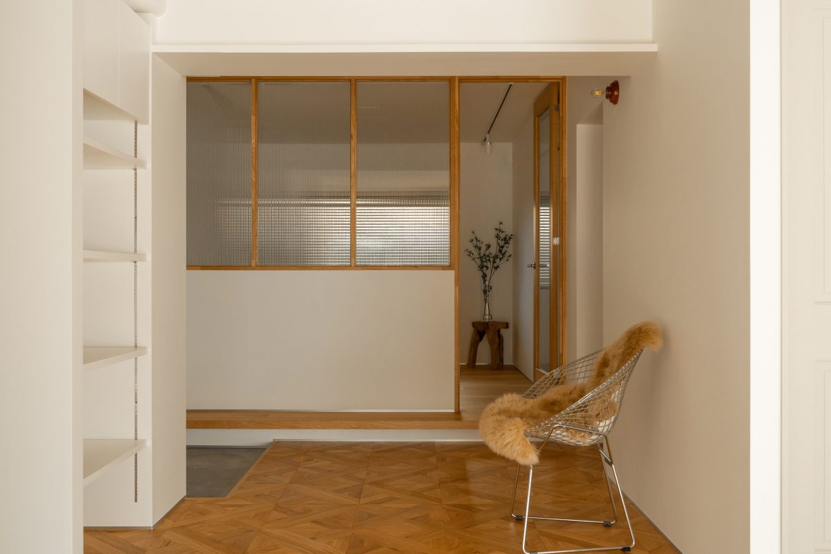 壁の上半分と扉にモールガラスを用いた寝室は、光をやわらかく受け止め、
