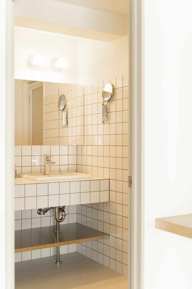 ホワイトチョコレートのような白いタイルと、きりりとしたステンレスの台。