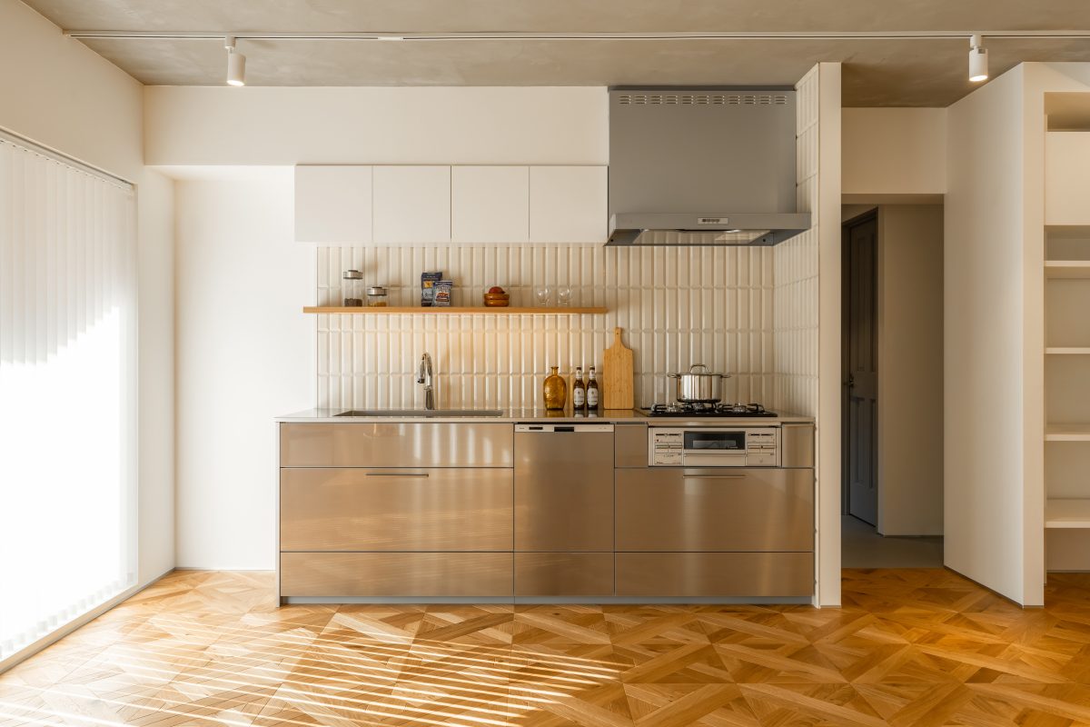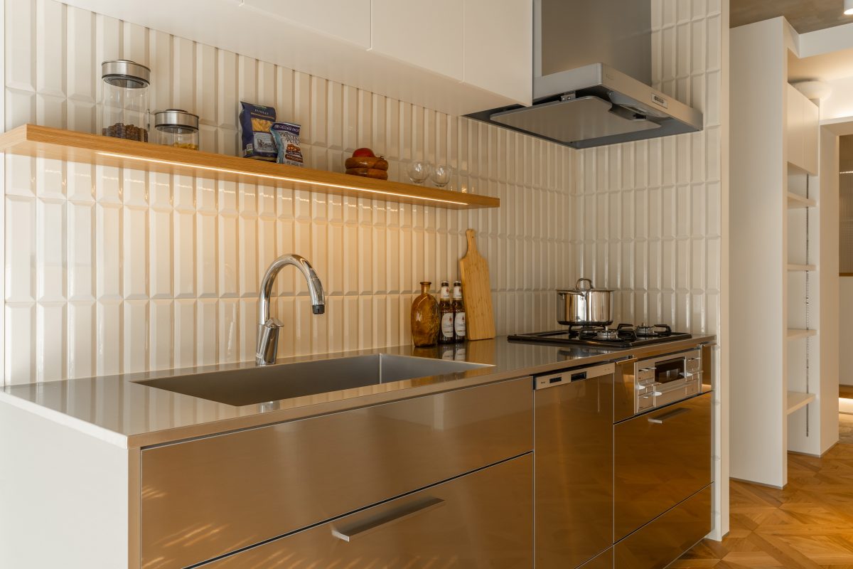 そこに温かみのある木の棚が加わり、異なる素材ながらも美しく調和の取れたキッチン。