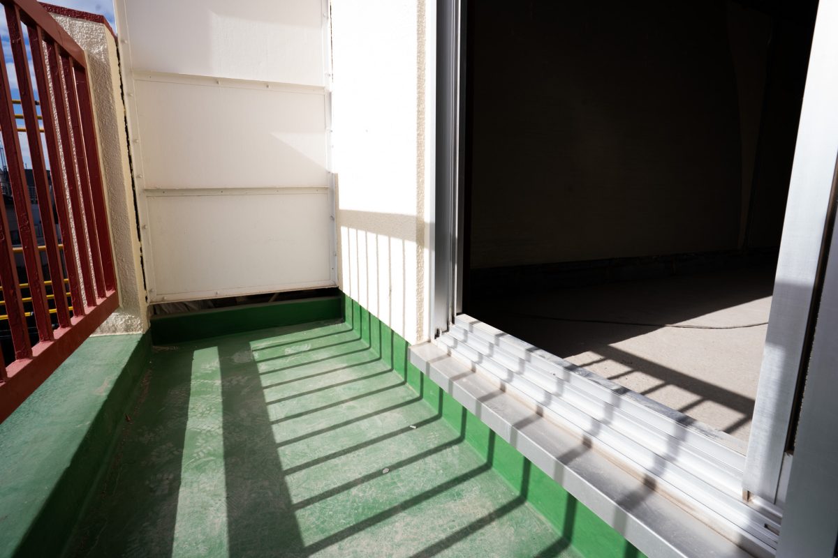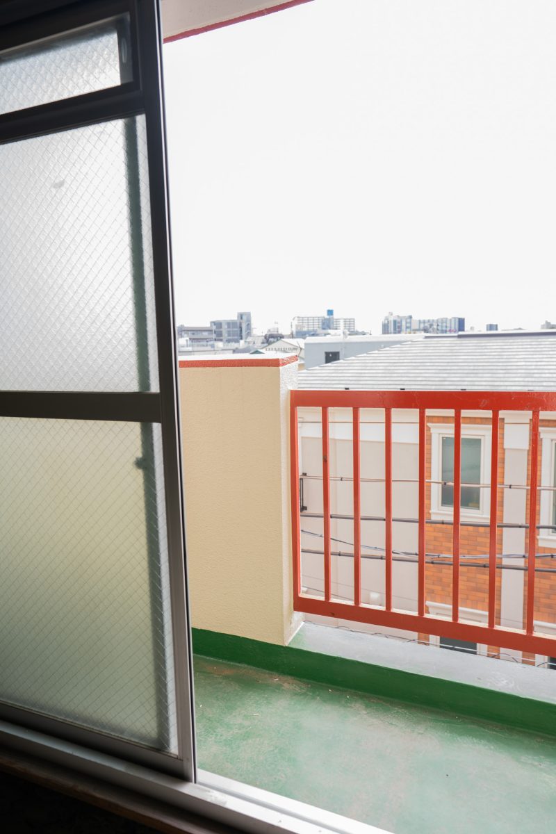 バルコニーに出ると、電車が走り抜ける姿が見えます。
