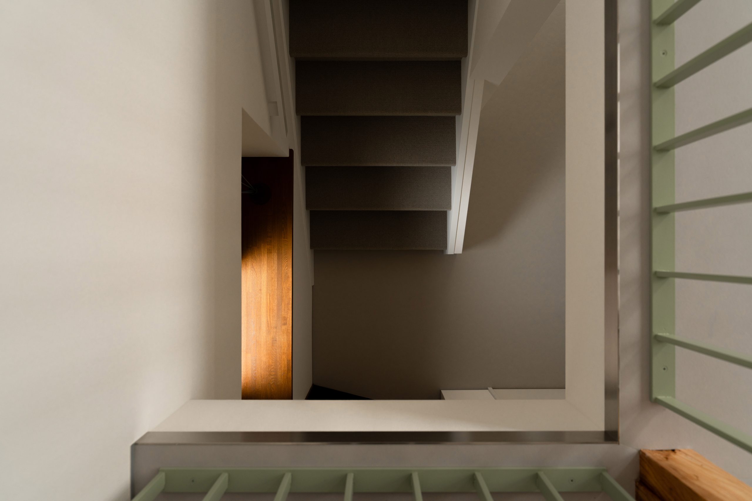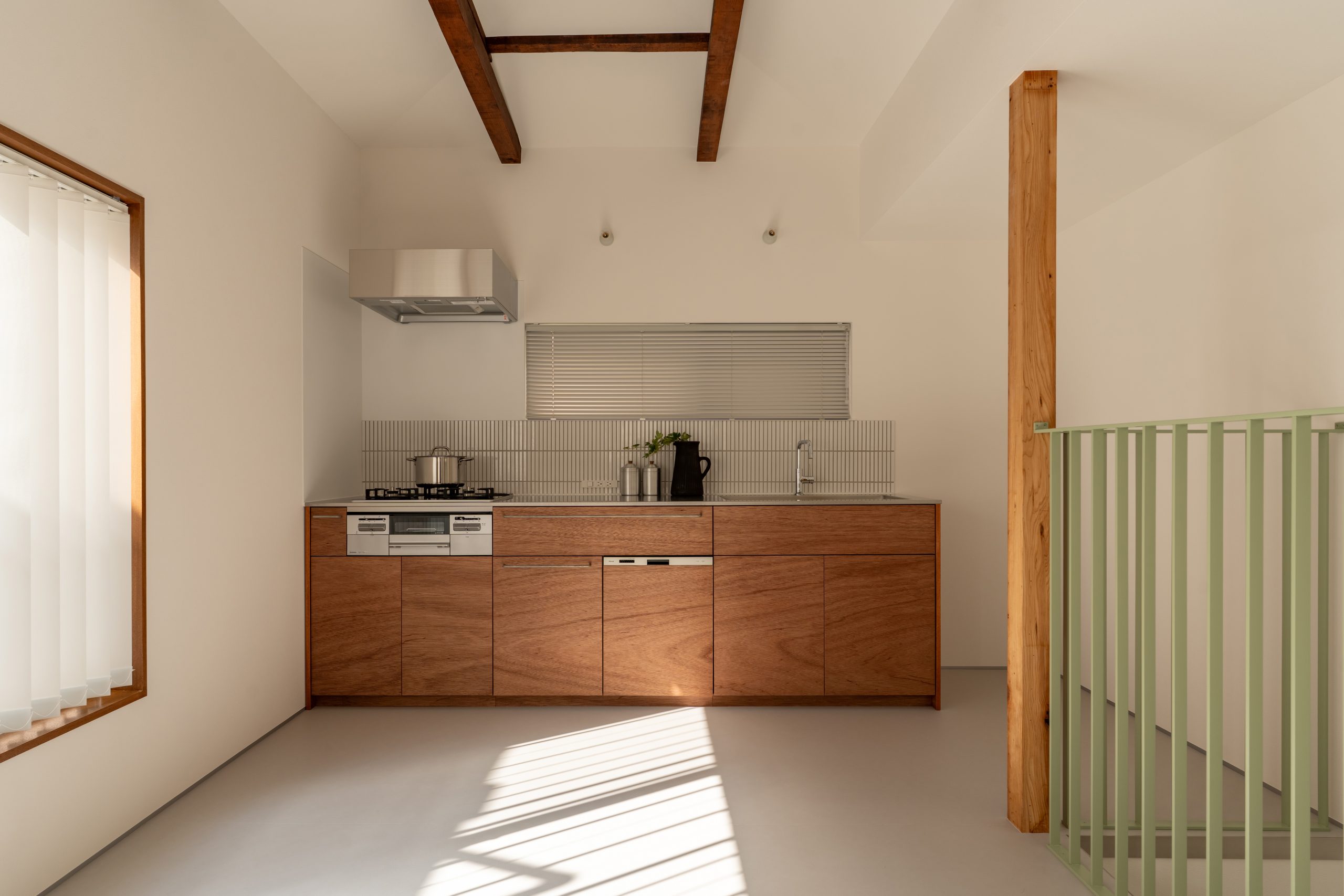 グレーの床材や、ペールグリーンのアイアン手すりといった新たな要素を加えました。